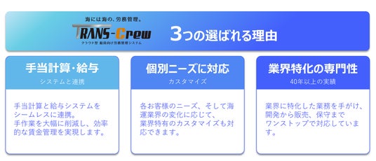 2022年の「船員法改正」に対応した船員向け労務管理システムとしてだけでなく、『TRANS-Crew』は船員業務におけるさまざまな課題をトータルで解決するソリューションを提供します。