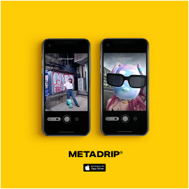 METADRIP は、3DCG で生成されたNFTをはじめとしたデジタル資産をスマートフォンのカメラを通じて、AR( 拡張現実 ) で着用/体験できる App Store向けスマートフォンアプリ。