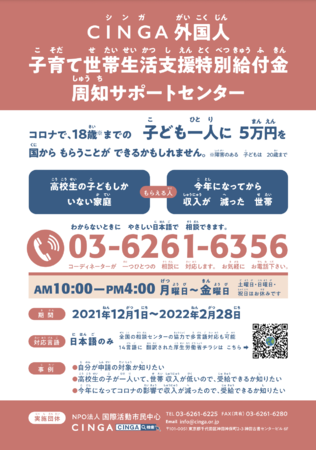 NPO法人国際活動市民中心CINGA(本社:東京都千代田区、代表:大久保 和夫)との協働により、多言語で給付金に関する相談ができるセンターを設置し、外国人当事者及び子ども食堂関係者からの相談に対応しました。また、2021年12月11日に同法人主催の下、新宿で開催された外国人向けの相談会において、子育て給付金の相談ブースを設け、来場した外国人相談者のほか、都内で外国人児童生徒の支援を行う教員などへ周知活動を実施しました。