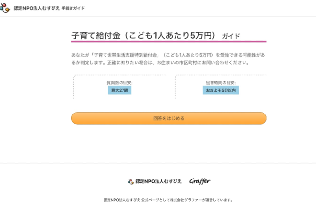 行政サービスのデジタル変革を手掛ける株式会社グラファー(本社:東京都渋谷区、代表取締役:石井大地)との協働により、自分が子育て給付金の支援要件に該当するか判定できる手続きガイドを厚生労働省の協力の下で作成し、一般公開しました。