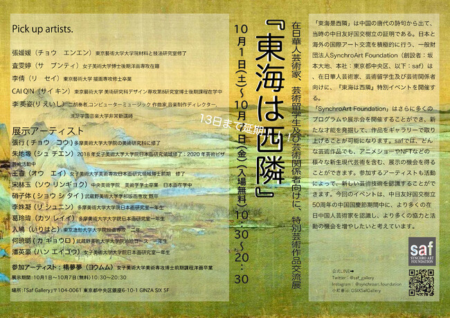 日本と海外の国際アート交流を積極的に行う、一般財団法人SynchroArt Foundation(創設者:坂本大地、本社:東京都中央区、以下:saf)は、在日華人芸術家、芸術留学生及び芸術関係者向けに、『東海は西隣』特別イベントを開催する。