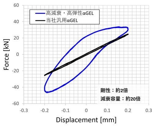 制振性と振動絶縁性は一般には二律背反の関係にあることが知られており、特にシリコーン素材を高減衰・高弾性率化することは困難とされてきました。図は新材料を10%ひずみで正弦波加振した場合の変位-力のヒステリシスループを表しており、新材料の方がループの傾き(等価剛性を表します)と面積(振動1サイクル当たりの等価粘性減衰容量)が共に当社汎用αGELのループよりも大きいこと、すなわち汎用αGELの剛性と減衰性が大きく進化したことが分かります。