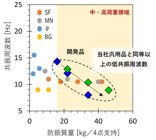 機械や装置類においては約20Hz以上の振動について絶縁ニーズが高い状況ですが、高い振動絶縁性を追及すると材料のばね定数を相対的に低くしなければならないため、低周波域で共振応答倍率が増大するケースが多くみられます。今回開発した新材料は従来の当社汎用防振材と同等以上の振動絶縁性(低共振周波数性能:左図)と高い制振性(共振応答倍率を低減する性能:右図)の両方を発揮します。