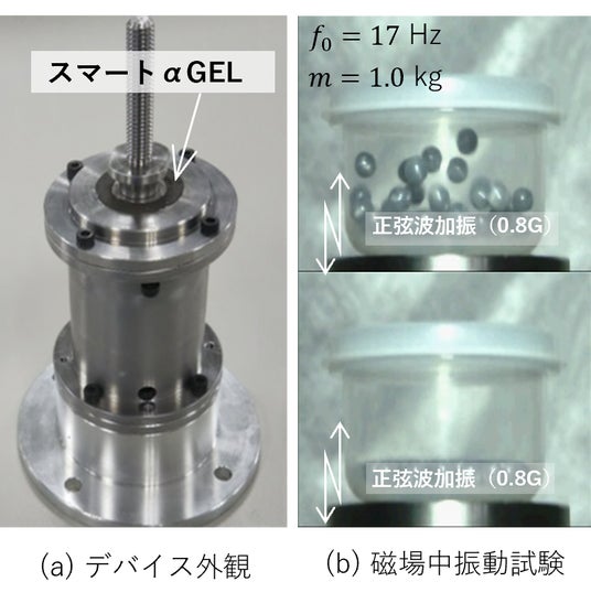 開発中の磁場応答αGELと電磁石を組み合わせたセミアクティブ防振デバイスを試作し、振動試験を行いました。デバイス共振点付近でデバイスに載せたビーズが跳ね上がりますが、ここで磁場をONにするとビーズの動きがピタリと収まります。