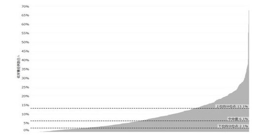 図表1:低栄養症例割合(低栄養症例数/全症例数)ベンチマーク。<分析条件>データ期間:2023年7月~12月の退院症例、対象病院数:1,066病院(低栄養症例あり:1,019病院)、対象症例:65歳以上、かつ様式1のA004030_3要介護情報_低栄養の有無(様式 1開始日時点)とA004030_5要介護情報_低栄養の有無(様式 1終了日時点)がどちらも「1:あり」の症例、低栄養の基準(様式1入力条件):(ア)様式1開始日又は様式1終了日を含む7日以内の日の血液検査において血中アルブミン値が3.0g/dl以下であるもの(イ)経口摂取ができない又は経口摂取のみで十分な栄養がとれないために、現に中心静脈栄養又は経鼻胃管・胃瘻等による経管栄養を実施しているもの