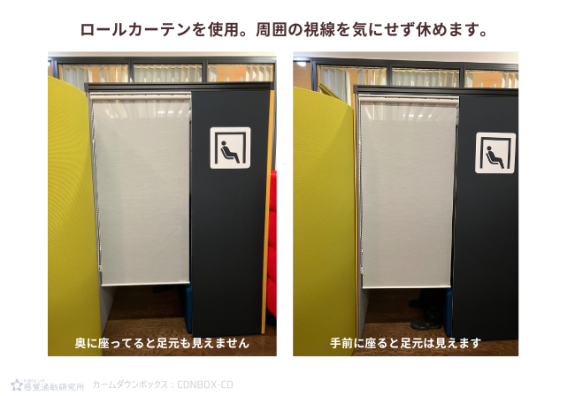 周囲のあるものや人が多い場所にいくと視覚情報が多く、疲れてしまって動けなくなったり、落ち着かず精神的に不安定にある場合があります。視覚情報を遮断し、かつ周囲の視線を気にせずに休憩できるカームダウンスペースは大切です。当商品はライトグレーのロールカーテンを使用していますが、外からボックス内は見えません。
