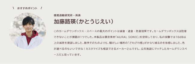 感覚過敏研究所を運営する株式会社クリスタルロード(本社:東京都中央区、代表:加藤路瑛)は、感覚過敏やパニック障害など、環境刺激に敏感な方々が外部の刺激を和らげて心身を落ち着かせるためのカームダウンスペースの普及と企画に取り組んでいます。この度、減音・防音効果のある調音素材「AURAL SONIC」を内蔵したカームダウンボックス『CONBOX-CD』を代理店として販売いたします。