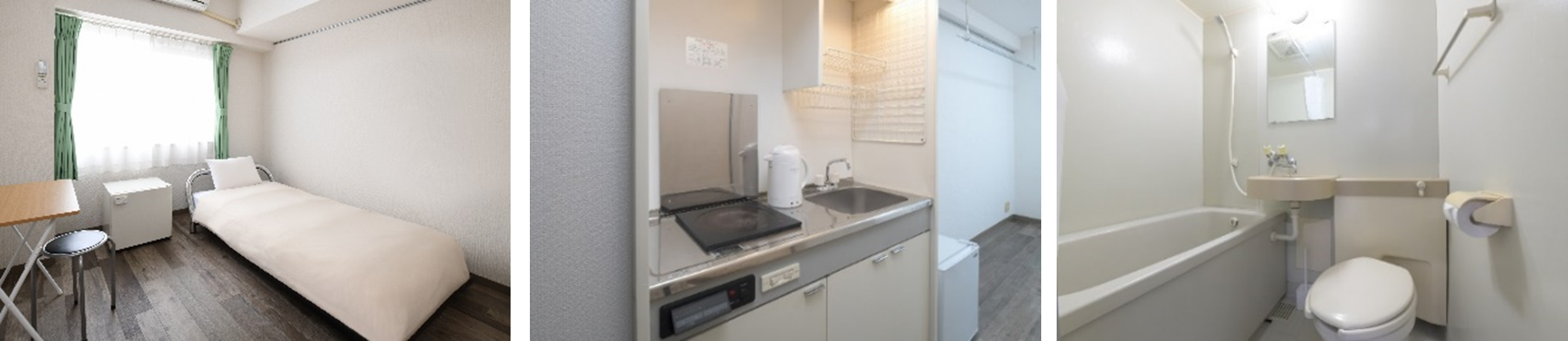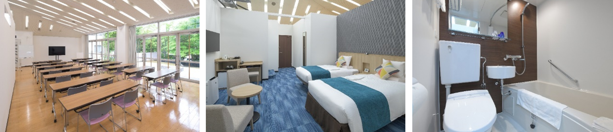 本アカデミーは、独自のプログラムを実現するため、ホテルの洋室、和室を再現したモックアップルームを完備しています。また、冷暖房・ミニ冷蔵庫・トイレ・バス・Wi-Fi完備のお部屋は1人1部屋の個室利用のため衛生的で安心です。その他施設内にはランドリールーム、庭園には実習生同士のコミュニケーションを深めることができるBBQテラスを備え、実習生が長期滞在でもプライバシーを守りながら快適に学習に集中できる環境が整っています。