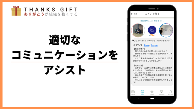 『THANKS GIFT』 は日々の感謝や称賛のコミュニケーションを元に、企業理念に即した行動の承認や応援をコインという形で従業員同士で贈り合うことが可能な社内コミュニケーションプラットフォームです。
