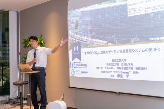 電力需給バランスを改善するための大容量蓄電技術である「カーボン空気二次電池システム」は、二酸化炭素を炭素に変換し発電する技術で、世界初の充放電実証に成功しました。同システム及び電力の効率的な供給や安定した運用を支援するプラットフォームの実用化を目指すスタートアップの創業について紹介しました。