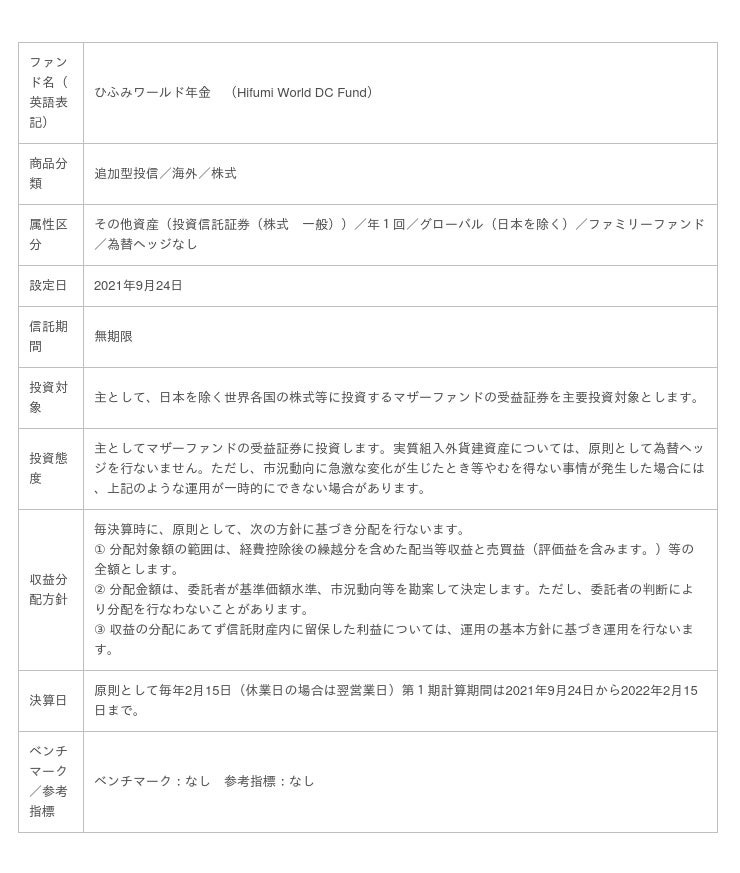 確定拠出年金向け投資信託「ひふみワールド年金」は2021年9月3日に有価証券届出書を関東財務局長に提出、2021年9月24日に設定・運用を開始いたしました。