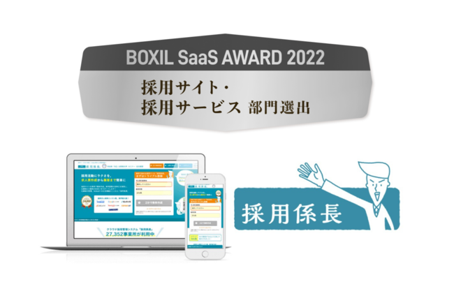 今回の「BOXIL SaaS AWARD 2022」では、「BOXIL総合ランキング部門」、「SaaS AWARD 2022部門」、「SaaS トレンド部門」の計3部門において、大賞2サービス、部門別大賞18サービス、部門別1位14サービス、部門賞109サービス(※2)が選出され、採用係長は2021年9月に発表された「BOXIL SaaS AWARD 2021 Autumn」での「採用サイト・サービス部門」の受賞に続き、同部門を連続受賞する運びとなりました。