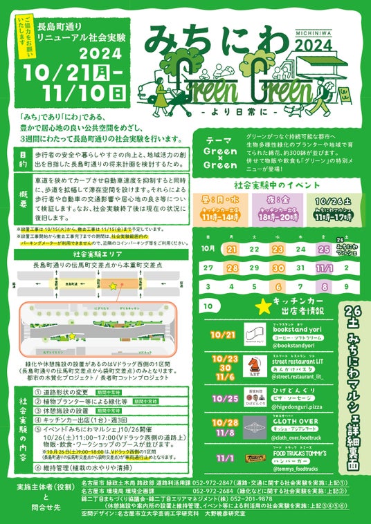 大日本ダイヤコンサルタント株式会社の社員がまちづくりの支援を行っている名古屋市中区錦二丁目地区では、2024年10月21日(月)から11月10日(日)の3週間、エリアを縦断する長島町通りのリニューアルに向けた社会実験を実施します。社会実験では、一方通行道路の車道幅員をスラローム状に狭窄したうえで、グリーンインフラを中心とした滞留空間の設置を行い、歩行者や自動車への交通影響、みどりの地域管理の可能性などを調査します。期間中にはキッチンカーなどが出店するほか、10月26日(土)には一部区間を通行止めにしてマーケットイベントが開催される予定です。