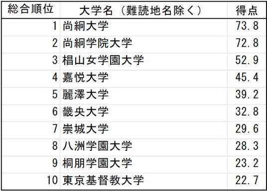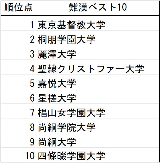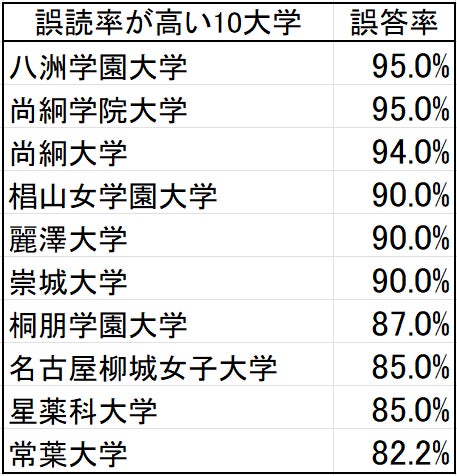 表1 漢字の読みが難しい大学(上位10大学)