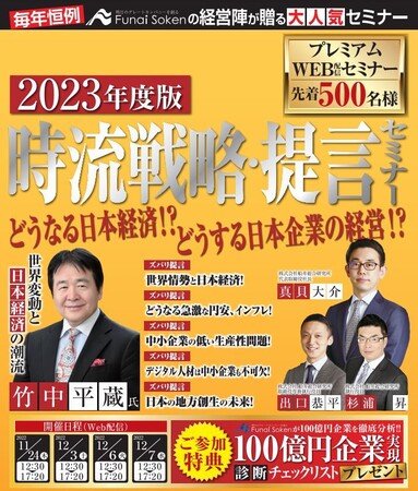 中堅・中小企業を対象に専門コンサルタントを擁する経営コンサルティング会社の株式会社船井総合研究所(本社:大阪府大阪市、代表取締役社長:真貝 大介、以下、船井総合研究所)は、企業経営者に向けて経営戦略を提言する『2023年度版 時流戦略・提言セミナー』を11月24日から12月7日にかけてオンライン形式で開催します。