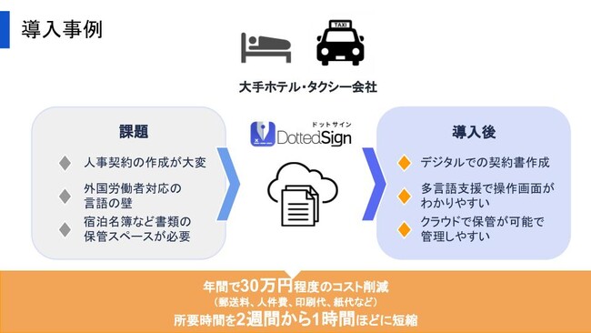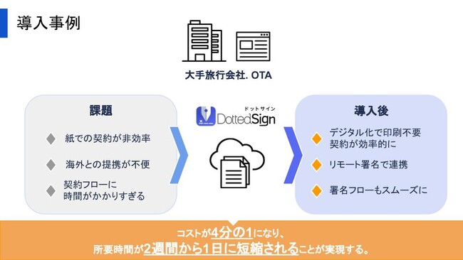 国内外にある大手旅行会社やホテルなどの業者様では、海外営業とのやり取りの進捗状況を把握するため、国をまたいで電子サインが承認できるツールの導入が求められており、DottedSignを導入しました。また、外国人を雇用する際には、リモート署名を活用し、関連する雇用契約書や労働条件通知などを一括で送付できるようにしています。このツールはPCとモバイルにも対応しており、簡単に契約を締結することができるというメリットがあります。