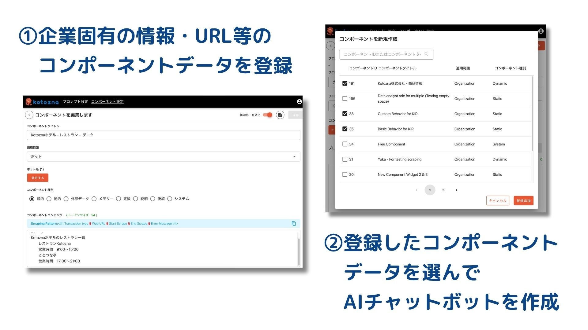 Kotozna TPGは、プログラミングやデータサイエンスの専門知識を必要とせず、URL、PDF、スプレッドシートといった企業固有の情報(動的/静的データ)をコンポーネントとして蓄積し組み合わせることで、各企業や目的に沿ってカスタマイズされた多言語生成AIチャットボットをノーコードで構築することが可能なサービスで、月額3万円~スタートできる手軽さが最大の特長です。