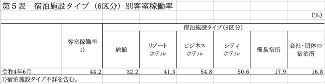 表:観光庁 宿泊旅行統計調査令和4年6月分(第1次速報値)第5表 宿泊施設タイプ(6区分)別客室稼働率