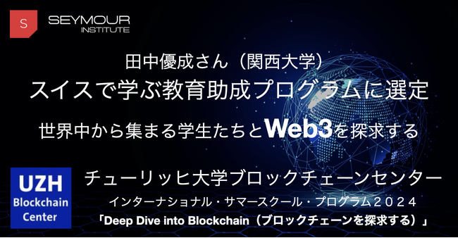 スイスと日本のイノベーションにおける産学連携活動を行う アカデミックシンクタンク SEYMOUR INSTITUTE 株式会社(代表:太田真、本社:東京都渋谷区広尾、以下「SEYMOUR」)は、チューリッヒ大学ブロックチェーンセンター(センター学長:Claudio J. Tessone教授)が開講する2024年度のインターナショナル・サマースクール「Deep Dive into Blockchain(ブロックチェーンを探求する)」に参加するための助成プログラム(受講料3,450スイスフラン)に、関西大学の田中優成さんを選定したことを発表します。田中さんは世界中から集まる学生たちと、2024