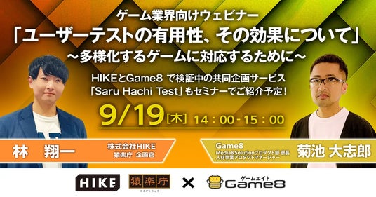 ゲーム総合情報サイト「Game8」を運営する株式会社ゲームエイト(本社:東京都渋谷区、代表取締役:沢村俊介 以下、ゲームエイト)と株式会社HIKE(本社:東京都新宿区、代表取締役:三上政高、以下「HIKE」)のチューニング・検証事業を担う猿楽庁(長官:小島尚也)は、9月19日(木)に「ユーザーテストの有用性、その効果について~多様化するゲームに対応するために~」をテーマにオンラインセミナー開催します。本セミナーでは検証中の共同企画サービス「Saru Hachi Test」についてもご紹介させていただく予定です。