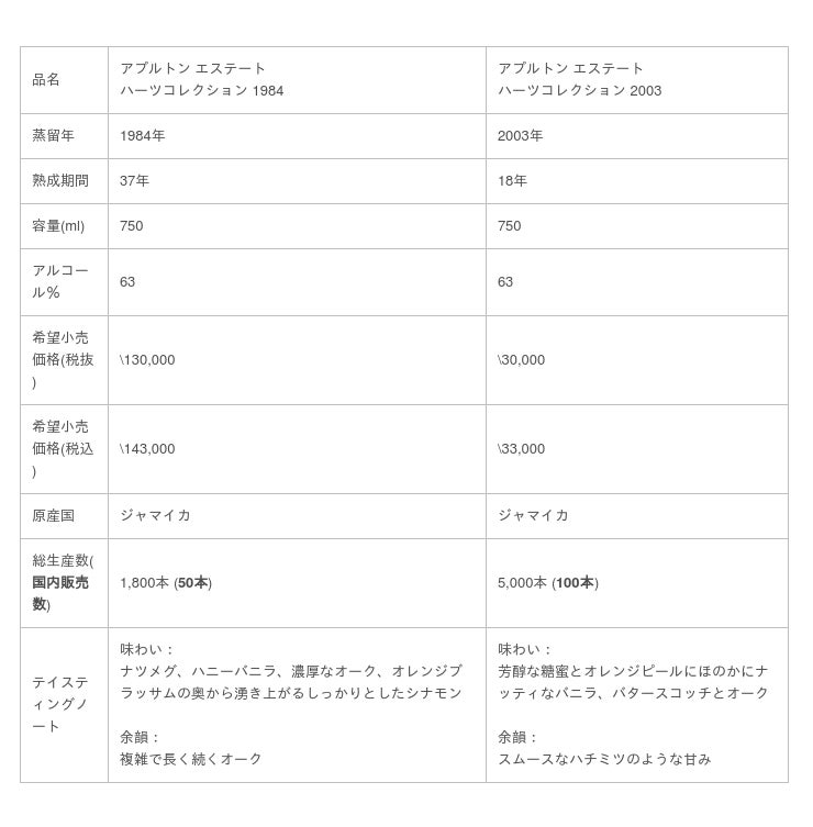 通常ラインナップのアプルトン エステートのラムはポットスチルとコラムスチル(連続式蒸留機)による2種類の原酒がブレンドされているのに対し、ハーツコレクションでは単年にポットスチルで蒸留された原酒のみが長期熟成の後ボトリングされており、スコッチウイスキーなどにあるシングルモルトに対して、アプルトン エステートではハーツコレクションをシングル・マルク・ラム*と称しています。シングル・マルク・ラムは原料となるサトウキビの収穫年や蒸留方法、原酒の熟成の違いによる個性を楽しむことができます。また、熟成は生産地であるジャマイカのナッソーバレーにあるアプルトン エステートの施設にて、高温多湿の自然環境を活かしたトロピカルエイジングで行われております。一般的にトロピカルエイジングは冷涼な環境での熟成に比べると同期間に2倍から3倍熟成が進むと言われており、その熟成のピークを見極めるのもマスターブレンダーの腕の見せ所となっております。今回のハーツコレクションの熟成期間は、1984が37年、2003が17年となっております。