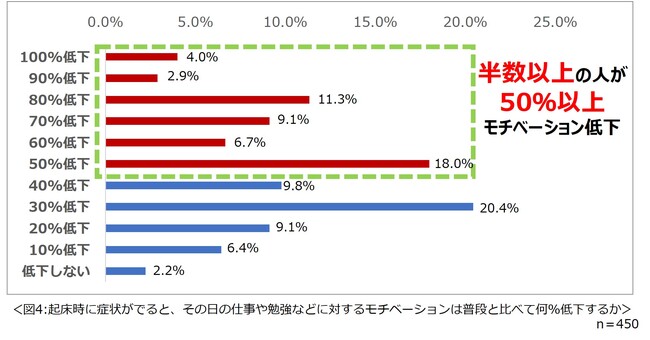 半数以上の人が「起床時に症状がでると、その日の仕事や勉強などに対するモチベーションが普段より50%以上低下する」と回答。