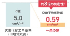 一条の超気密性能は、国の定めた次世代省エネルギー基準の「C値※1」である5.0cm²/m²をはるかに上回る0.59cm²/m²※2をマーク。これは、一番寒さの厳しい北海道(I地域)の基準もクリアするほどの高性能です。