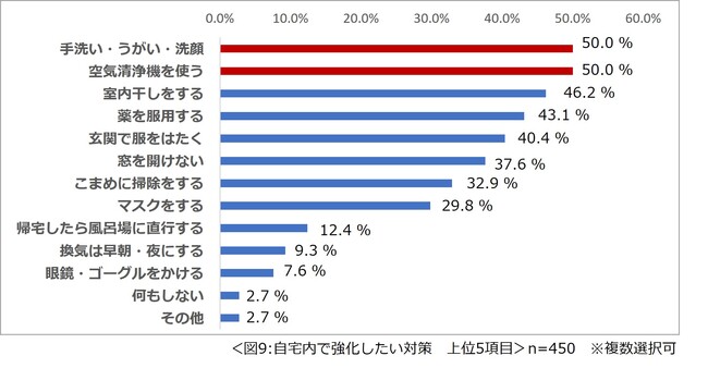 さらに「自宅内で強化したい対策はありますか?」の質問に対しては、1位は「手洗い・うがい・洗顔」「空気清浄機を使う」が同率で、5割の方が回答しました。続いて2位「室内干しをする」(46.2%)、3位「薬を服用する」(43.1%)という結果になりました。(図9)