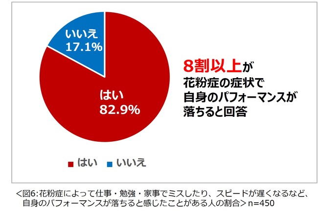 「花粉症によって仕事・勉強・家事でミスしたり、スピードが遅くなるなど、自身のパフォーマンスが落ちると感じたことがありますか?」の問いに、「はい」と答えた人が8割以上いました。(図6)