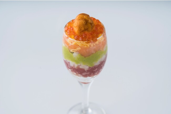 また、マグロ、アボカド、サーモン、錦糸玉子で美しく施したカクテルグラスには、イクラと雲丹をトッピング。層が進むにつれ、食材によるマッチングが楽しめるこだわりの一品です。