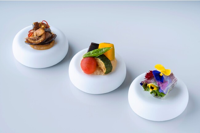 前菜は、福岡県産野菜を使った季節の三種。ミニマルなプレゼンテーションの中に、シェフが丁寧に織りなす繊細な味をお楽しみください。