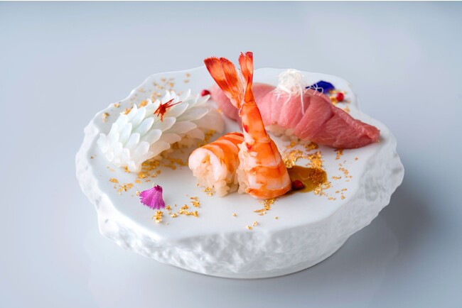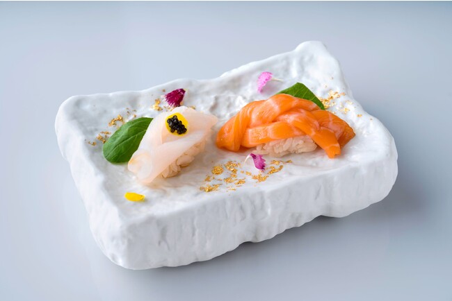 金粉で飾ったプレートを彩る寿司五貫は、美しく手綱にアレンジされた季節の白身、編込まれたサーモン、松かさ切りでフリルのように仕上げた烏賊、脂がのった本マグロ、ともづなオリジナルブレンドの醤油と合わせた車海老など、職人の技を駆使した本格的な旬の寿司をご堪能いただけます。