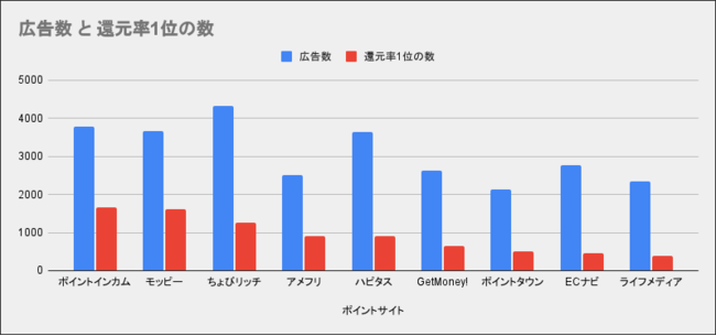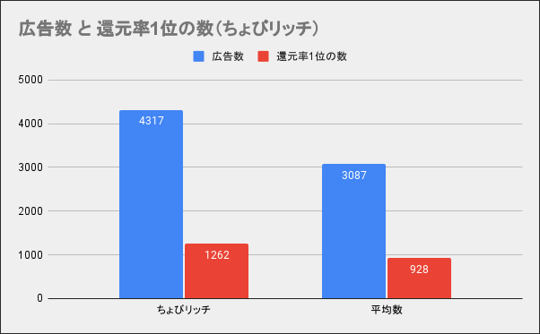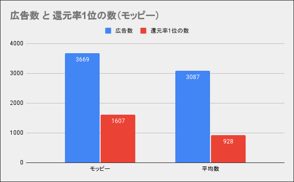 還元率1位の広告数を見ると、ちょびリッチがモッピーよりもわずかに勝っています。