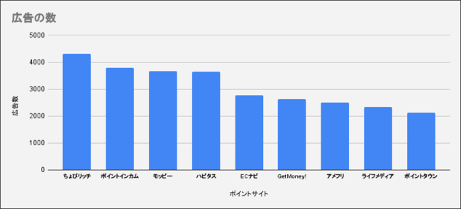 広告の数だけを見ると、ちょびリッチが一番多く、次にポイントインカム、モッピーと続きます。