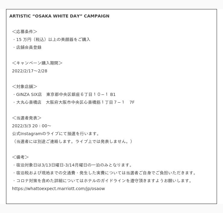 期間中、ARTISTIC の美顔器ご購入者の中から抽選で、3 月 13 日(日)~14 日(月)W OSAKA ファンタスティックスイート 2 名 1 組・1 泊の宿泊券を限定 3 部屋プレゼント。