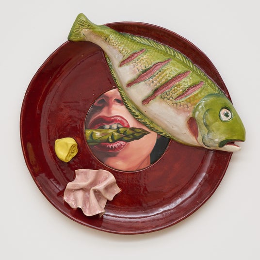 カナダのアーティスト、ステファニー・ハイエの作品は機知に富みます。ハイエは「食べる」という人の根源的な行為をテーマとし、超現実的で、時に不穏なタブローを形成します。そこでは、写実的な絵画とそれを取り囲むフレームの役割を果たす陶芸という二つの要素には、同等の意味の重みが与えられています。