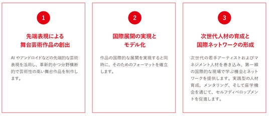 第一に、AIやアンドロイドなどのテクノロジーを用い、音楽、ダンス、美術、思想といった分野を横断する舞台芸術作品を創造すること。第二に、国際共同制作という形式を通じて作品の国際展開を実現し、持続可能な海外展開のモデルを構築すること。そして第三に、企画・制作から上演、国際展開に至るまでの全過程を次世代に開き、若手アーティストおよびアートマネジメント人材がプロジェクトメンバーとして実践的に関与することで、経験や知見、ネットワークを共有・継承していくことです。
