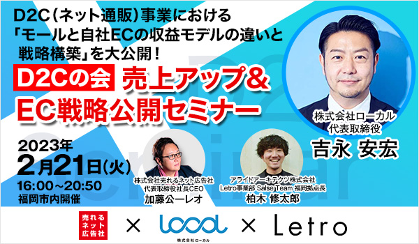 株式会社売れるネット広告社(本社:福岡市早良区、代表取締役社長CEO:加藤公一レオ、以下 売れるネット広告社) は、2023年2月21日(火)に福岡天神にて『D2Cの会』売上アップ&EC戦略公開セミナーを開催いたします。株式会社ローカル 代表取締役の吉永安宏様、アライドアーキテクツ株式会社 福岡拠点長の柏木修太郎様、そして株式会社売れるネット広告社 代表取締役社長CEO 加藤公一レオとの3社共催で、D2C(ネット通販)の売上アップのノウハウや「モールと自社ECの収益モデルの違いと戦略構築」についてお話いたします。福岡天神での開催で、事前申込が必要です。