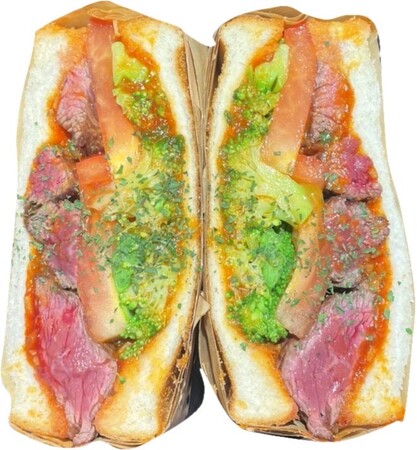 看板メニューのミートサンドにトマトとブロッコリーを加え、ガーリックを効かせたトマトベースのタレで味付けした12月限定のサンドイッチを販売します。