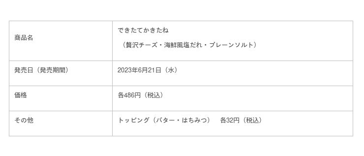6月21日(水)から6月30日(金)までの10日間、2,160円(税込)以上お買い上げの方、毎日先着100名様に「かきたねキッチン」のオリジナルマスキングテープをプレゼント。また、かきたねキッチン公式LINEにお友達登録をすると、『できたてかきたね』のトッピングを1品無料でプレゼントいたします。ぜひこの機会にららぽーと富士見店でしか味わえないできたてかきたねをお楽しみください。