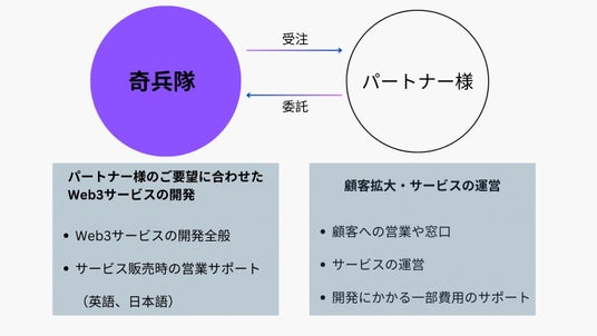 株式会社奇兵隊(本社:東京都港区、代表取締役CEO:阿部遼介、以下「奇兵隊」)は、この度、「Web3パートナープログラム」を開始したことをお知らせします。「Web3パートナープログラム」では、当社と共同でWeb3サービスの開発とレベニューシェアを目指すパートナー企業を募集いたします。