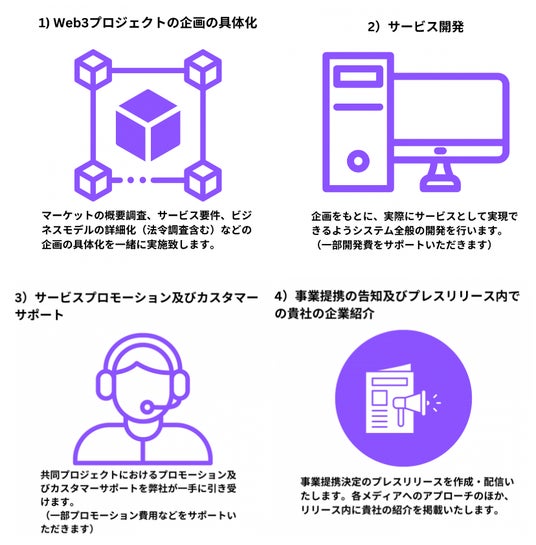 本プログラムに参画することで、パートナー企業は当社から以下の各種支援を受けながら、Web3ビジネスモデルの創出が可能となります。
