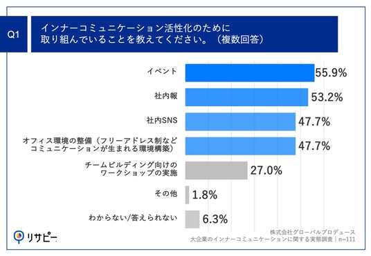 「Q1.インナーコミュニケーション活性化のために取り組んでいることを教えてください。(複数回答)」(n=111)と質問したところ、「イベント」が55.9%、「社内報」が53.2%、「社内SNS」が47.7%という回答となりました。