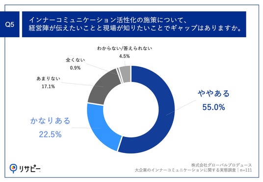 「Q5.インナーコミュニケーション活性化の施策について、経営陣が伝えたいことと現場が知りたいことでギャップはありますか。」(n=111)と質問したところ、「ややある」が55.0%、「かなりある」が22.5%という回答となりました。