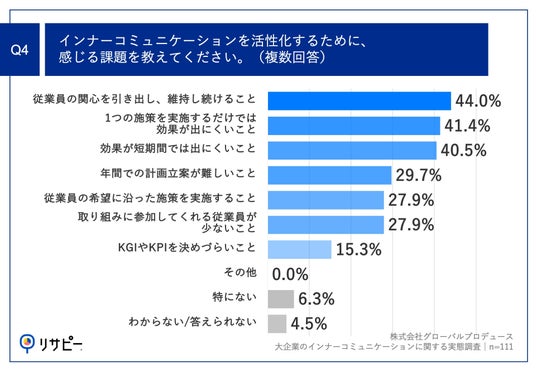 「Q4.インナーコミュニケーションを活性化するために、感じる課題を教えてください。(複数回答)」(n=111)と質問したところ、「従業員の関心を引き出し、維持し続けること」が44.0%、「1つの施策を実施するだけでは効果が出にくいこと」が41.4%、「効果が短期間では出にくいこと」が40.5%という回答となりました。