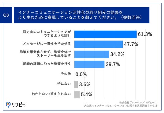 「Q3.インナーコミュニケーション活性化の取り組みの効果をより生むために意識していることを教えてください。(複数回答)」(n=111)と質問したところ、「双方向のコミュニケーションができるような設計」が61.3%、「メッセージに一貫性を持たせる」が47.7%、「施策を単発化させず、施策全体でストーリーを生み出す」が34.2%という回答となりました。