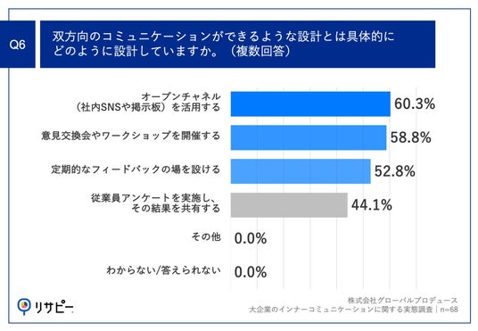 Q3で「双方向のコミュニケーションができるような設計」と回答した方に、「Q6.双方向のコミュニケーションができるような設計とは具体的にどのように設計していますか。(複数回答)」(n=68)と質問したところ、「オープンチャネル(社内SNSや掲示板)を活用する」が60.3%、「意見交換会やワークショップを開催する」が58.8%、「定期的なフィードバックの場を設ける」が52.8%という回答となりました。
