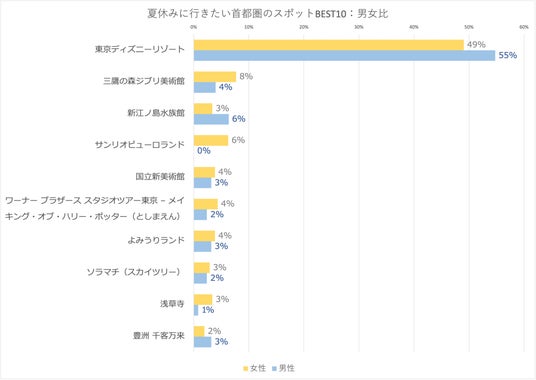 「夏休みに行きたい首都圏のお出かけスポットを教えてください。(n=341)」と質問をした結果、圧倒的な差で「東京ディズニーリゾート」が1位となった(341票中172票)。
