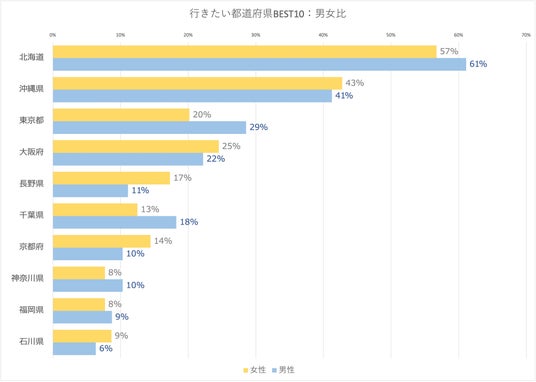 北海道、沖縄県、東京都の並びは一般的な人気の旅行先ランキングと変わらないが、長野県が5位にランクインしたりと「夏休みに行きたい」という質問だからこその、結果も見られた。