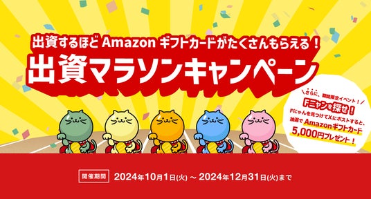株式会社レプス(本社:京都市 代表:堀 公亮)が運営する不動産クラウドファンディングポータルサイト「ファインディングファンド」は、2024年10月1日(火)~2024年12月31日(火)の期間中、出資した対象サービス(サイト)の数に応じてAmazonギフトをプレゼントする「出資マラソンキャンペーン」を開催します。